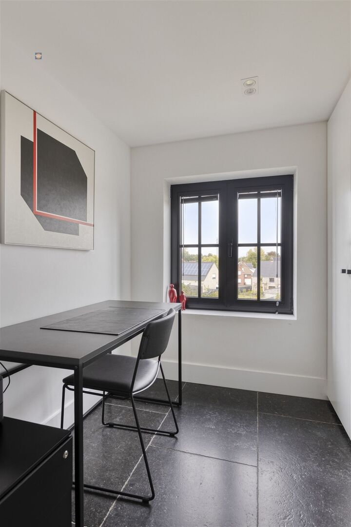 De indeling is als volgt: ruime inkomhal met gastentoilet, bureau of kinderkamer, berging , lichtrijke leefruimte met design gashaard, dimbare sfeerverlichting, hypergeïnstalleerde keuken met hoogwaardige afwerking en een aangrenzende eetkamer met uitzicht op het overdekte, automatische terras.